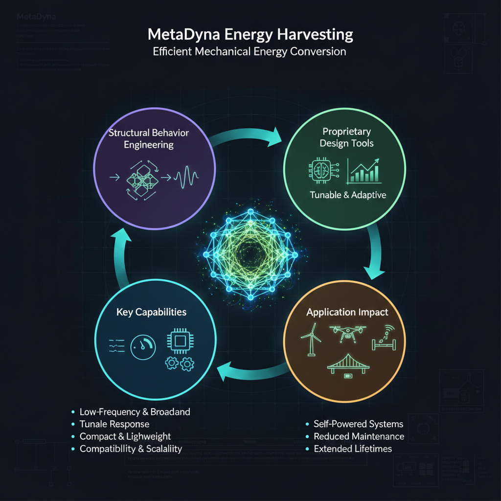 Energy harvesting aims to convert ambient mechanical excitations—like vibration, motion, and structural responses—into usable electrical energy. Traditional systems often struggle with narrow operating bandwidths, rigid configurations, or material-dependent limitations. MetaDyna tackles these challenges with a fundamentally different approach: metamaterial based and mechanical conversion mechanisms, allowing mechanical energy to be captured far more effectively under diverse, real-world conditions.